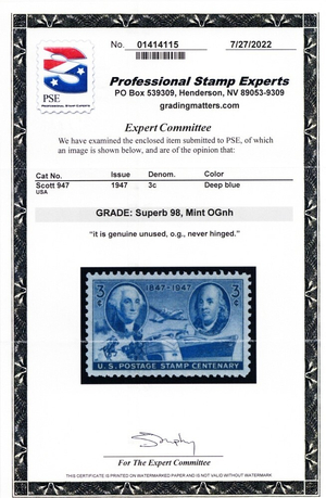 947, Mint NH 3¢ Superb With PSE Graded 98 Certificate * Stuart Katz