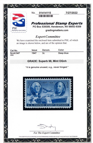 947, Mint NH 3ยข Superb With PSE Graded 98 Certificate * Stuart Katz