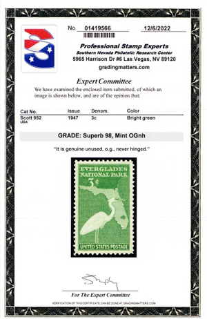 952, Mint NH 3¢ Superb With PSE Graded 98 Certificate * Stuart Katz