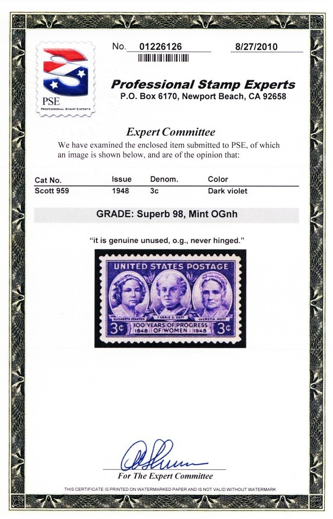 959, Mint NH 3¢ Superb With PSE Graded 98 Certificate * Stuart Katz