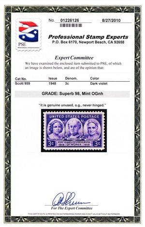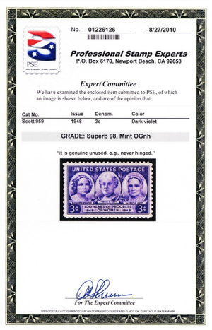 Due to the high cost of obtaining certificates we will only refund the cost of the stamp and not the cost of the certificate for stamps that sell for less than $250 that come back with a negative certificate. Stamps that sell for above $250 will receive a full refund for both the price of the stamp and cost of the certificate if it should come back not as described. For U.S. stamps only certificates from either APS, PSE or from the Philatelic Foundation are accepted, however "graded" certificates or "encased" items are not accepted.