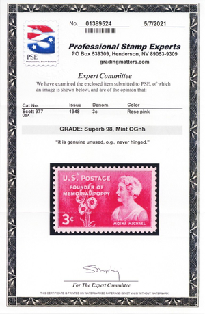 977, Mint NH Superb 3¢ With Graded 98 PSE Certificate* Stuart Katz
