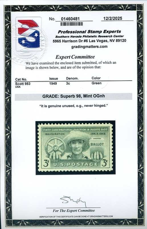 983, 3¢ Puerto Rico Election, PSE Graded Superb 98 Mint NH Certificate, SMQ $55