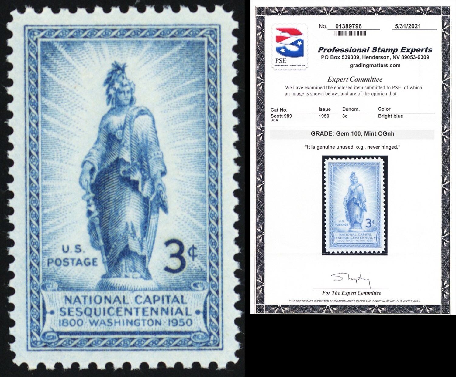 989, Mint Superb NH 3¢ - With Graded GEM 100 PSE Certificate - Stuart Katz
