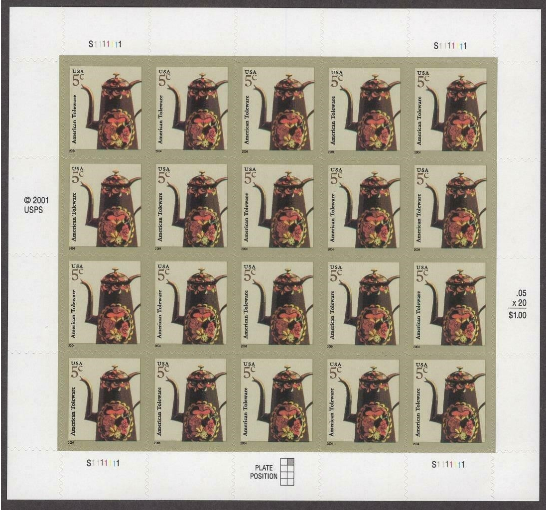 American Toleware Sheet of Twenty 5 Cent Postage Stamps Scott 3756