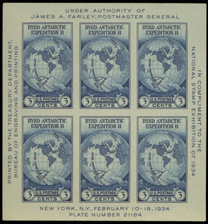 Byrd Antarctic Expedition II Souvenir Sheet of Six 3 Cent Stamps Scott 735