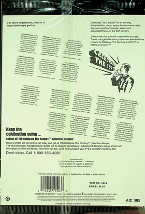 This is for one pane of 15 X 33 cent US Postage First-Class Stamps - Celebrate the Century - 1940's (Scott No. 3186 a-o) (Item No. 5543) issued by the U.S. Postal Service on 2/18/1999.  It is in Mint condition and factory sealed.