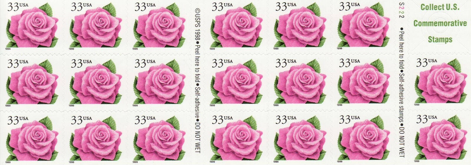 Coral Pink Rose Pane of Twenty 33 Cent Postage Stamps Scott 3052d