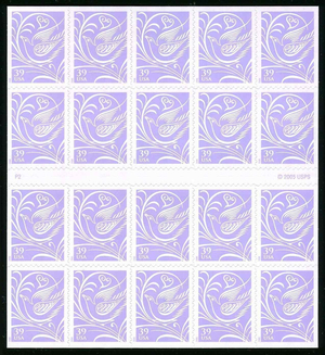 Dove Wedding Pane of Twenty 39 Cent Postage Stamps Scott 3998
