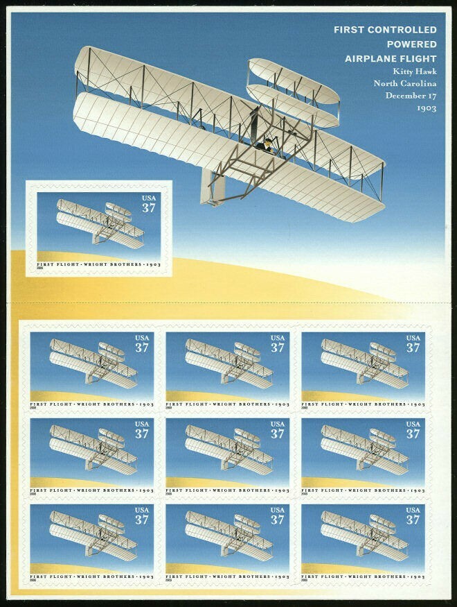 First Flight of Wright Brothers Sheet of Ten 37 Cent Stamps Scott 3783