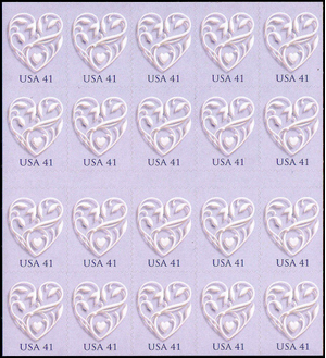 Heart Full Pane of Twenty 41 Cent Postage Stamps Scott 4151