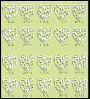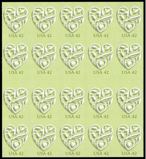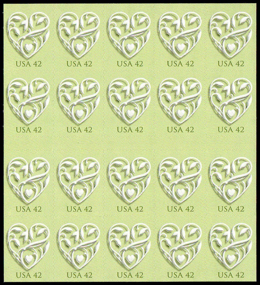 Heart Full Pane of Twenty 42 Cent Postage Stamps Scott 4271