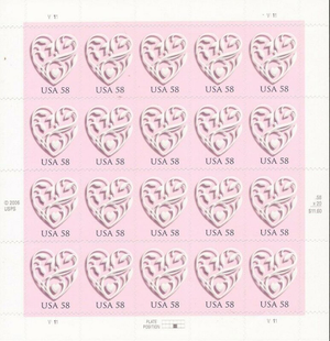 Heart Full Pane of Twenty 58 Cent Postage Stamps Scott 4152