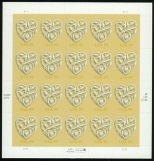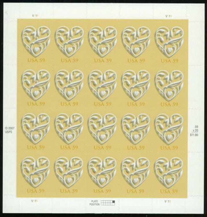Heart Full Pane of Twenty 59 Cent Postage Stamps Scott 4272