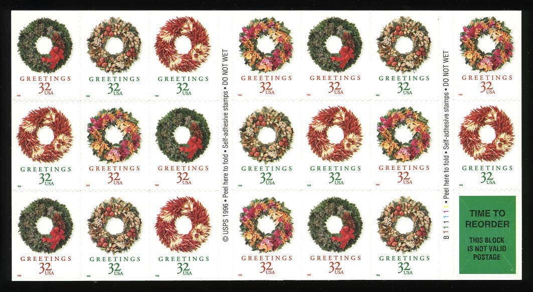 Holiday Wreaths Christmas Booklet Pane of Twenty 32 Cent Stamps Scott 3252e