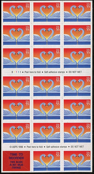 Love Kissing Swans / Heart Shape Pane of 20 Stamps - 55 Cent Postage Stamps 3124