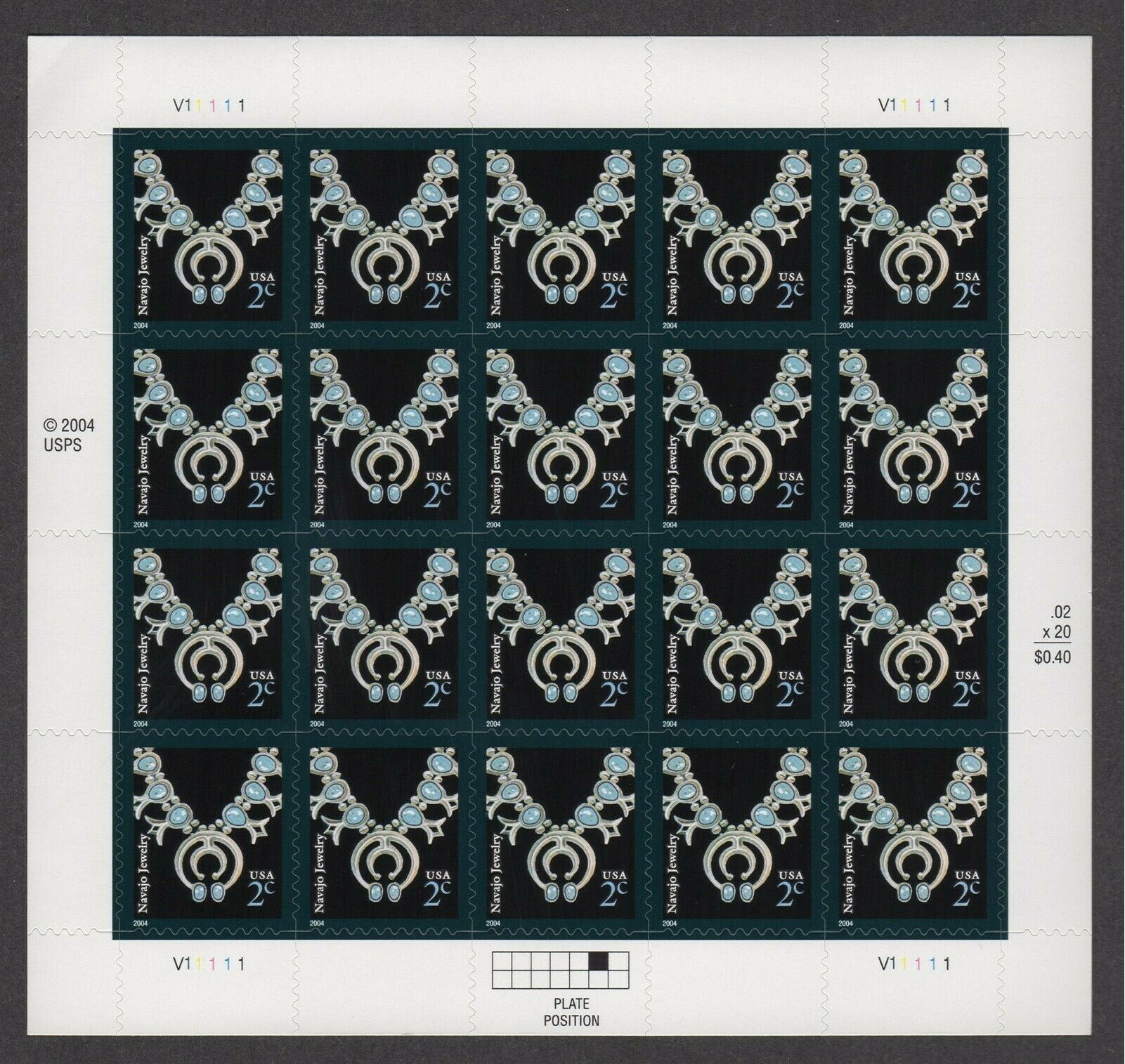Navajo Jewelry Sheet of Twenty 2 Cent Postage Stamps Scott 3750