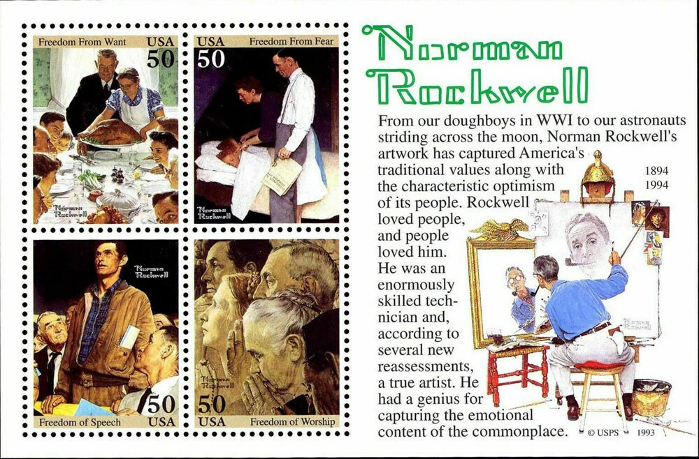 Norman Rockwell Souvenir Sheet of Four 50 Cent Postage Stamps Scott 2840