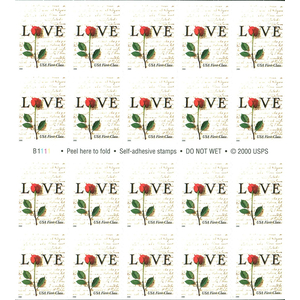 Red Rose and Love Letters Pane of Twenty 34¢ Stamps For Weddings Scott 3497