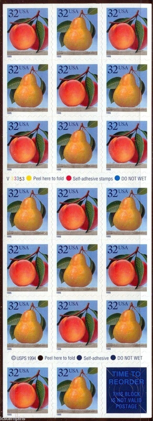 Pears & Peaches Booklet of Twenty 32 Cent Postage Stamps Scott 2494a