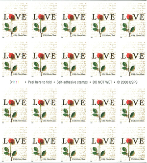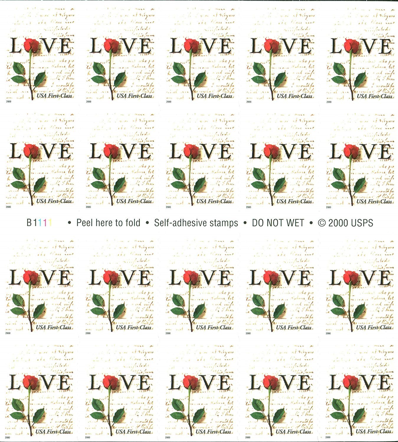 Red Rose and Love Letters Pane of Twenty 34 Cent Stamps Great For Wedding 3496