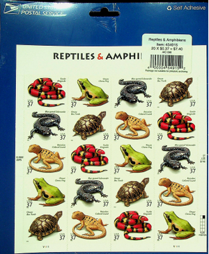 This is for one pane of 20 X 37 cent US Postage First-Class Stamps - Reptiles and Amphibians (Scott No. 3814-3818) (Item No. 454915) issued by the U.S. Postal Service on 10/7/2003.  It is in Mint condition and factory sealed.