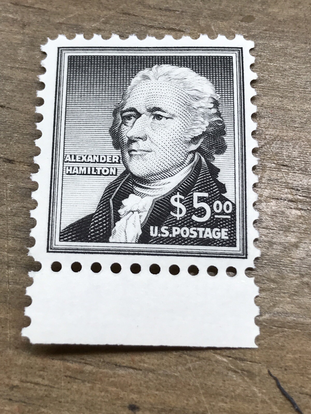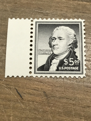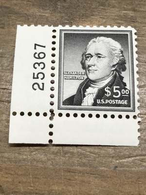 Scott 1053 1956 $5.00 Hamilton Issue Mint XF OG NH Cat $47.50. Shipped with USPS First Choice Of 1 Stamp