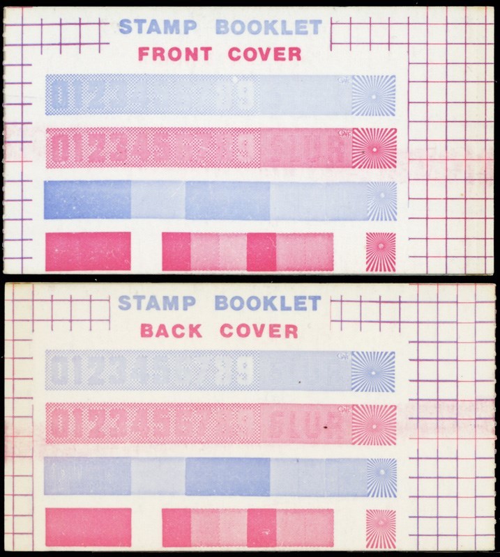 1980s Dummy Test Booklet with "Front Cover" in red. Complete booklet containing single pane of 8, dull gum "For Testing Purposes Only" stamps. Made by Goebel of Germany from materials supplied by the Bureau of Engraving and Printing. Printed cover in red and blue shows various printers test and registration markings. Very scarce booklet, mint never hinged very fine.