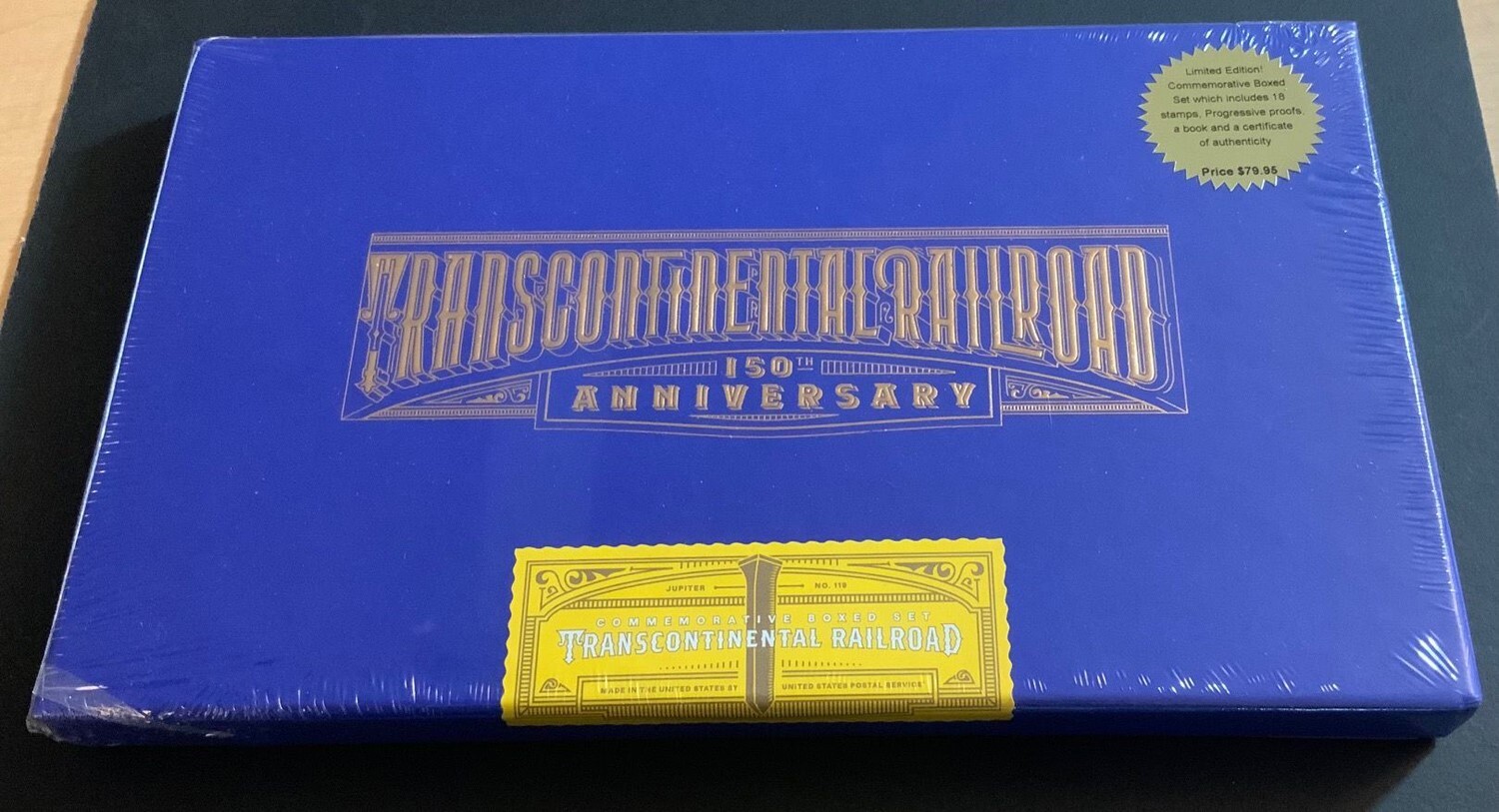 Limited edition and no longer available! This Commemorative Boxed Set was issued by the U.S. Postal Service in recognition of the 150th Anniversary of the Transcontinental Railroad. It features a sheet of stamps, plus six authentic proofs from the printing process--the proofs are only available in this boxed set--and guidebook.. Never opened, sealed in the original shrink wrap!