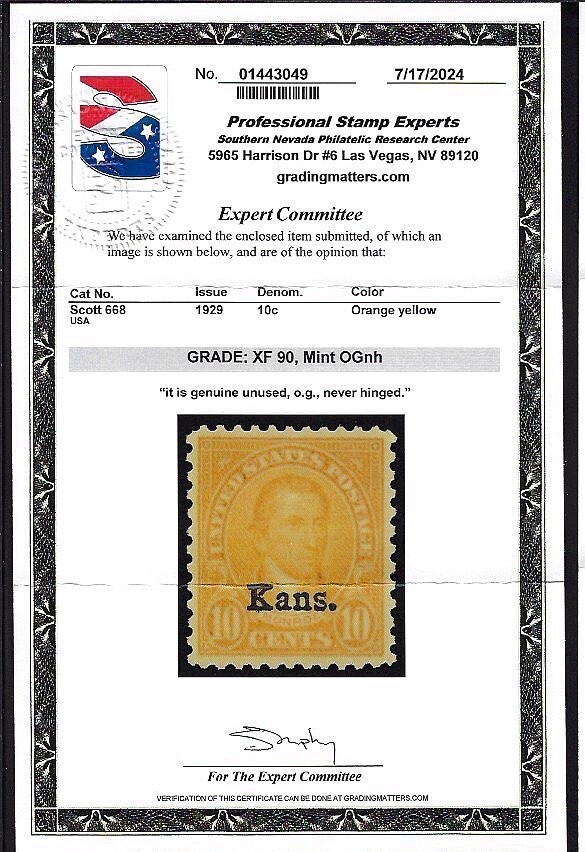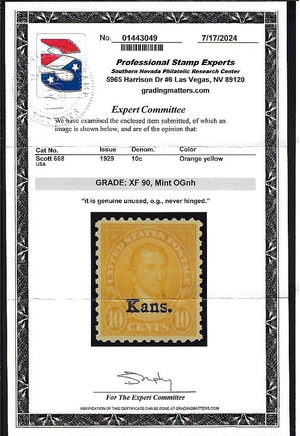 WCstamps: U.S. Scott #668 / 10c Kansas, XF, 2024 PSE Cert Grade 90 / SMQ $80