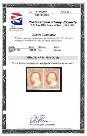 11, Mint XF VLH 3¢ Pair - With Graded 90 PSE Cert & PFC - Stuart Katz