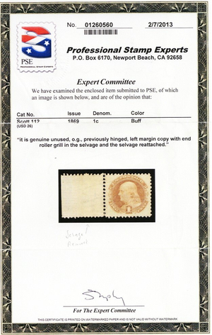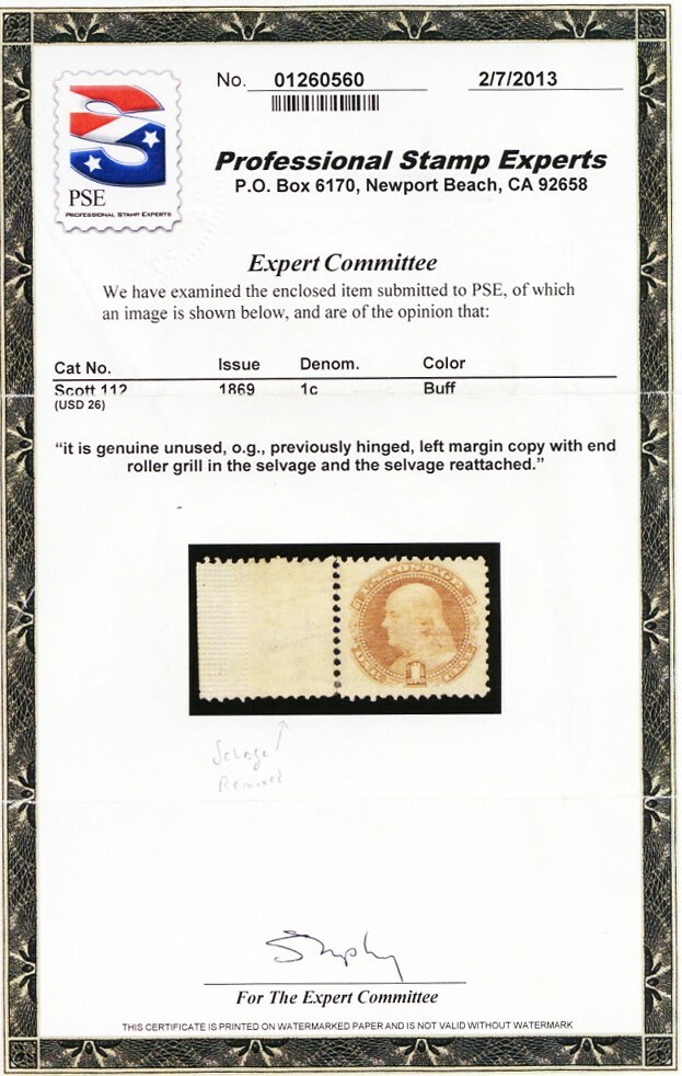 112, Mint 1¢ VF OG LH GEM With PSE Certificate Cat $575.00 - Stuart Katz