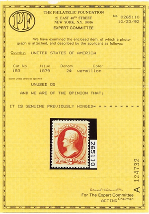 Due to the high cost of obtaining certificates we will only refund the cost of the stamp and not the cost of the certificate for stamps that sell for less than $250 that come back with a negative certificate. Stamps that sell for above $250 will receive a full refund for both the price of the stamp and cost of the certificate if it should come back not as described. For U.S. stamps only certificates from either APS, PSE or from the Philatelic Foundation are accepted, however "graded" certificates or "encased" items are not accepted.