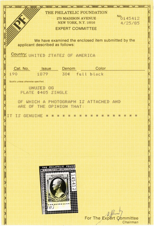 Due to the high cost of obtaining certificates we will only refund the cost of the stamp and not the cost of the certificate for stamps that sell for less than $250 that come back with a negative certificate. Stamps that sell for above $250 will receive a full refund for both the price of the stamp and cost of the certificate if it should come back not as described. For U.S. stamps only certificates from either APS, PSE or from the Philatelic Foundation are accepted, however "graded" certificates or "encased" items are not accepted.