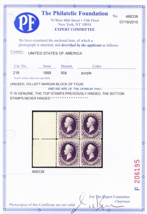 218, Mint 90¢ VF LH/NH With Clean PFC Certificate CV $7200+ - Stuart Katz