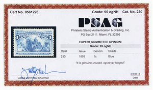 No refunds will be made after 60 days after the sale date unless extra time is granted. Due to the high cost of obtaining certificates we will only refund the cost of the stamp and not the cost of the certificate. For U.S. stamps only certificates from either APS, PSE or from the Philatelic Foundation are accepted, however "graded" certificates or "encased" items are not accepted.