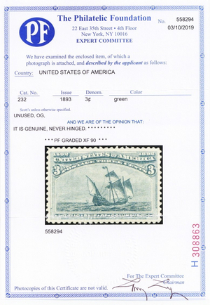 232, Mint NH XF 3¢ Columbian - With Graded 90 PFC Certificate * Stuart Katz
