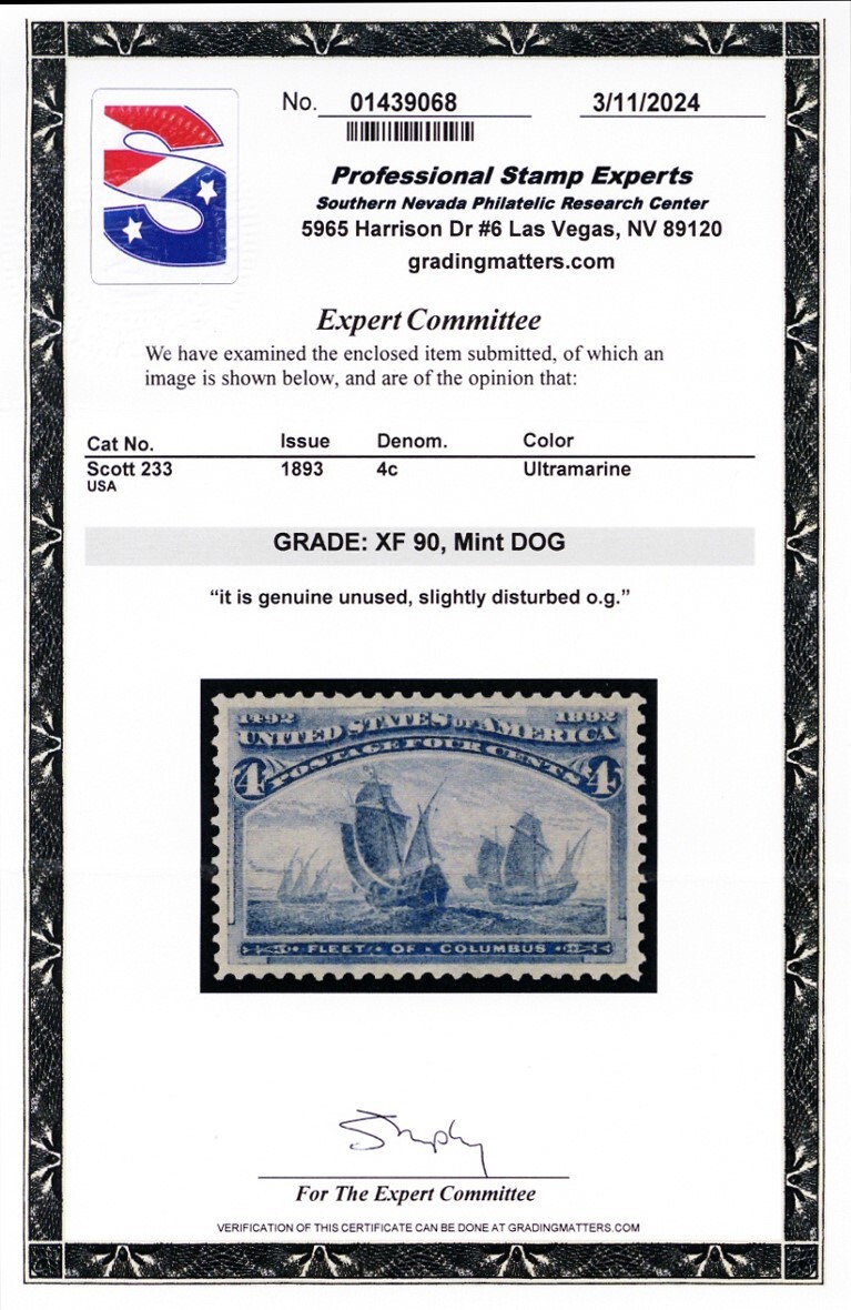 233, Mint NH XF 4¢ - With Graded 90 PSE Certificate READ * Stuart Katz