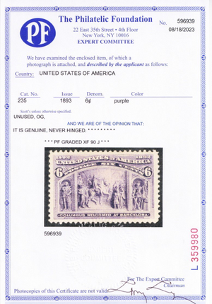 235, Mint XF NH 6ยข Columbian - Graded 90J JUMBO PFC Certificate - Stuart Katz