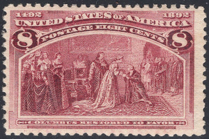 Scott# 236 F-VF MNH OG 8 cent Columbian depicting Columbus restored to favor. Scan shows this one has nice margins. Nice looking Columbians are really getting tough to find so don't wait too long to buy great stamps from this classic series since the prices are really moving up