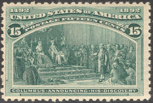 Scott# 238 F-VF Mint Lightly Hinged OG 15 cent Columbian depicting Columbus announcing his discoveries. Very fresh and fault free. Scan shows this one has nice margins. Original Gum is as good as you can find on this Columbian. Scott catalog value is:$750.00. Nice looking Columbians are really getting tough to find so don't wait too long to buy great stamps from this classic series since the prices are really moving up.