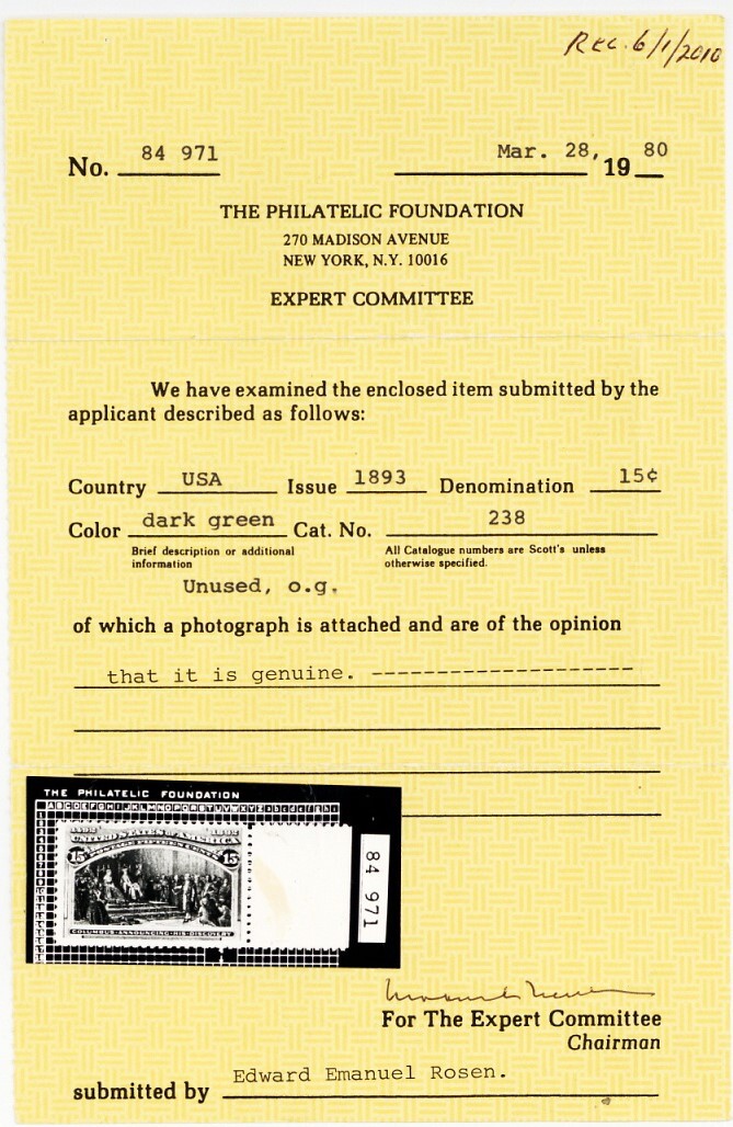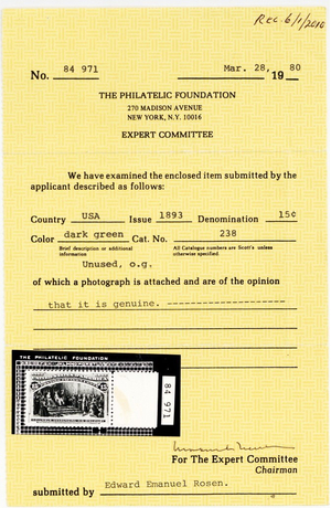 Due to the high cost of obtaining certificates we will only refund the cost of the stamp and not the cost of the certificate for stamps that sell for less than $250 that come back with a negative certificate. Stamps that sell for above $250 will receive a full refund for both the price of the stamp and cost of the certificate if it should come back not as described. For U.S. stamps only certificates from either APS, PSE or from the Philatelic Foundation are accepted, however "graded" certificates or "encased" items are not accepted.
