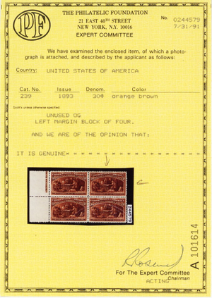 No refunds will be made after 60 days after the sale date unless extra time is granted. Due to the high cost of obtaining certificates we will only refund the cost of the stamp and not the cost of the certificate. For U.S. stamps only certificates from either APS, PSE or from the Philatelic Foundation are accepted, however "graded" certificates or "encased" items are not accepted.