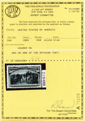 No refunds will be made after 60 days after the sale date unless extra time is granted. Due to the high cost of obtaining certificates we will only refund the cost of the stamp and not the cost of the certificate. For U.S. stamps only certificates from either APS, PSE or from the Philatelic Foundation are accepted, however "graded" certificates or "encased" items are not accepted.