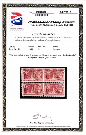 241, Mint FVF NH $1 Block - Columbian With PSE Certificate * Stuart Katz