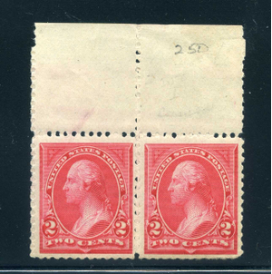 250 pair, type I 2¢ Washington, Mint VLH, light crease along bottom, Scott $60