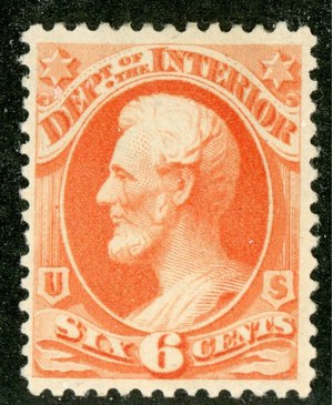 (25117 ) US stamp scott# O18 MH (1873 6c Vermillion, Interior, Lincoln, Hard Paper)