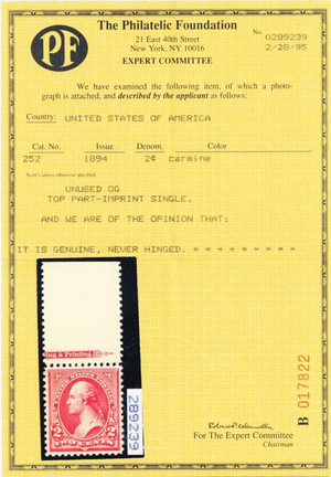 Due to the high cost of obtaining certificates we will only refund the cost of the stamp and not the cost of the certificate for stamps that sell for less than $250 that come back with a negative certificate. Stamps that sell for above $250 will receive a full refund for both the price of the stamp and cost of the certificate if it should come back not as described. For U.S. stamps only certificates from either APS, PSE or from the Philatelic Foundation are accepted, however "graded" certificates or "encased" items are not accepted.