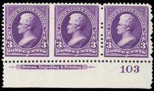 253, Mint LH 3¢ PL# & Imprint Strip of 3 CV $475 - Stuart Katz