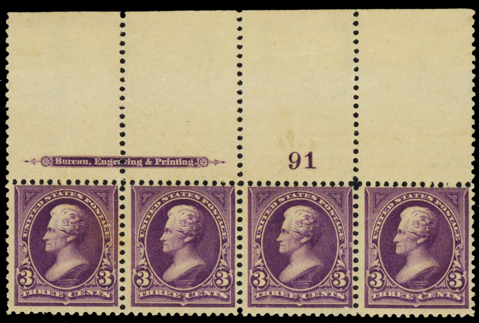 253, Mint NH 3¢ PL# & Imprint Strip of 4 CV $1560 - Stuart Katz